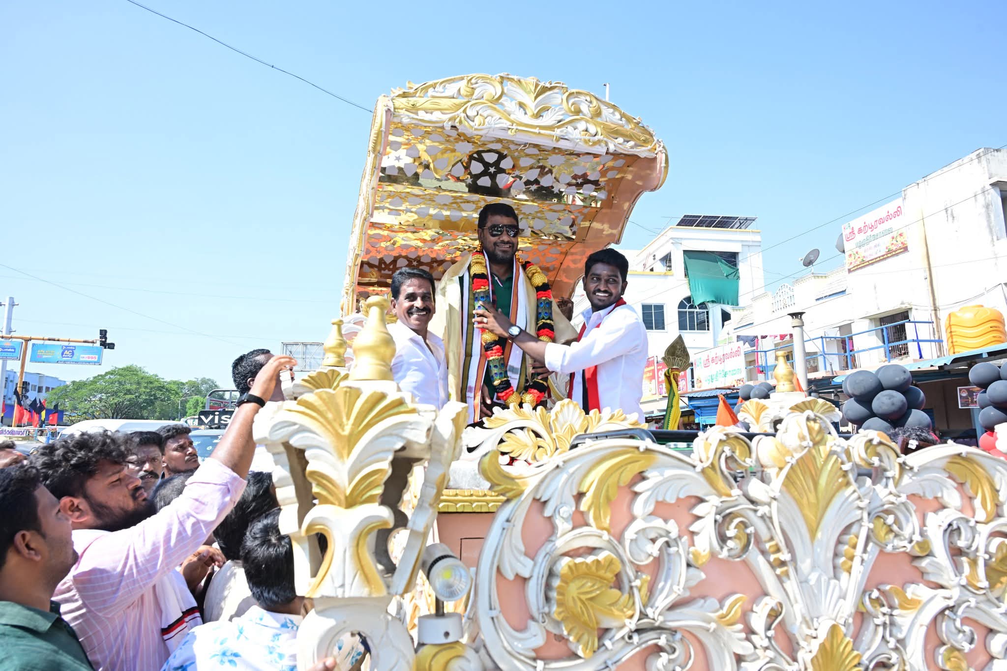 மண்ணச்சநல்லூர் பேரூராட்சிக்குட்பட்ட வார்டு 1 முதல் 18 வரை இன்று நடைபெற்ற அனல் பறக்கும் பிரச்சாரத்தில், வேட்பாளர் கதிரவன் அவர்களுக்குப் பொதுமக்கள் உற்சாக வரவேற்பு அளித்தனர். செல்லும் இடமெல்லாம் மேளதாளங்கள் முழங்க, மலர் தூவி, தொண்டர்களும் பொதுமக்களும் அவரை ஆரவாரத்துடன் வரவேற்றனர்.