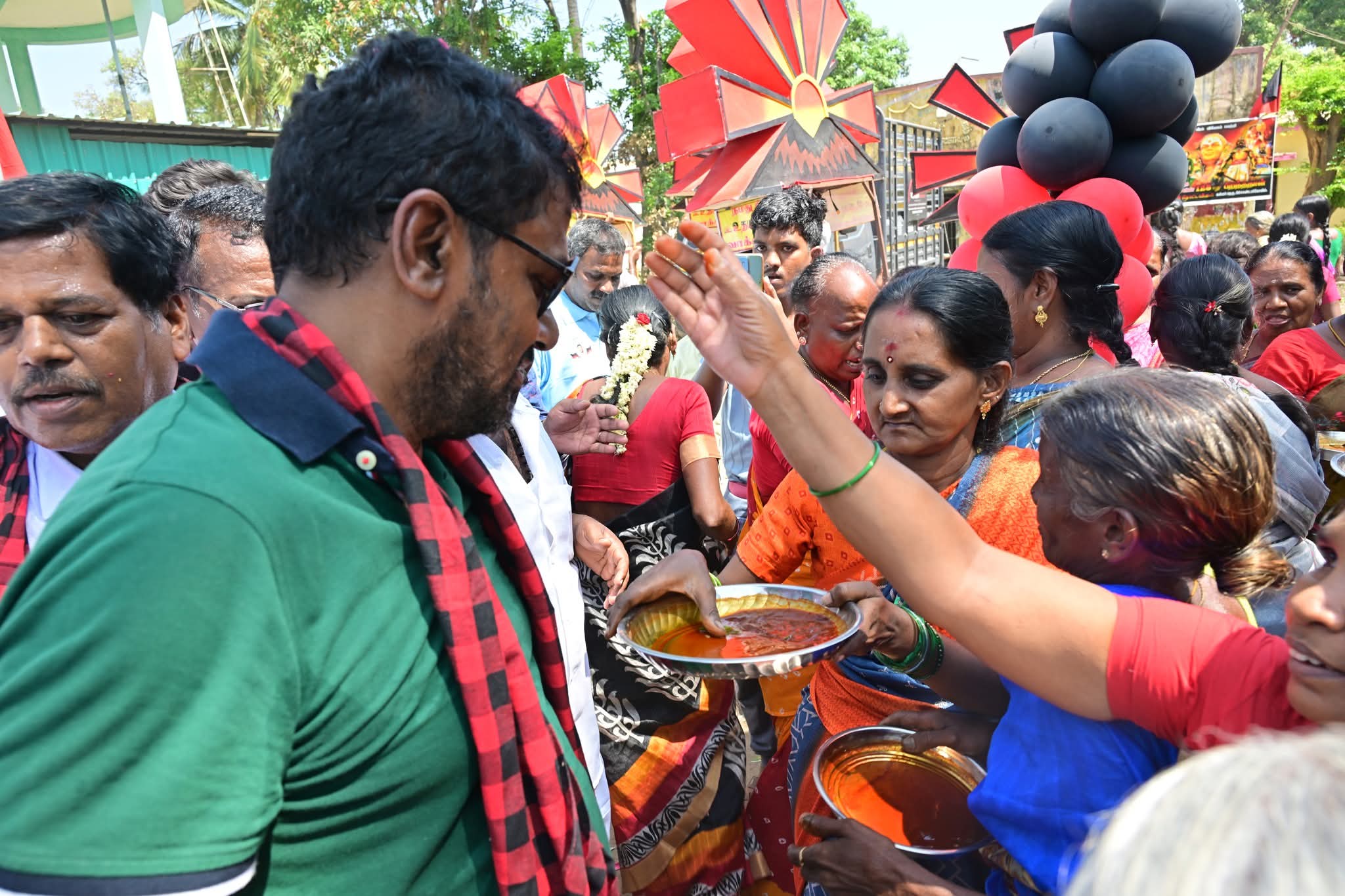 தங்கள் வீட்டுப் பிள்ளையாகக் கருதி பெண்கள் அவருக்கு ஆரத்தி எடுத்தனர்.