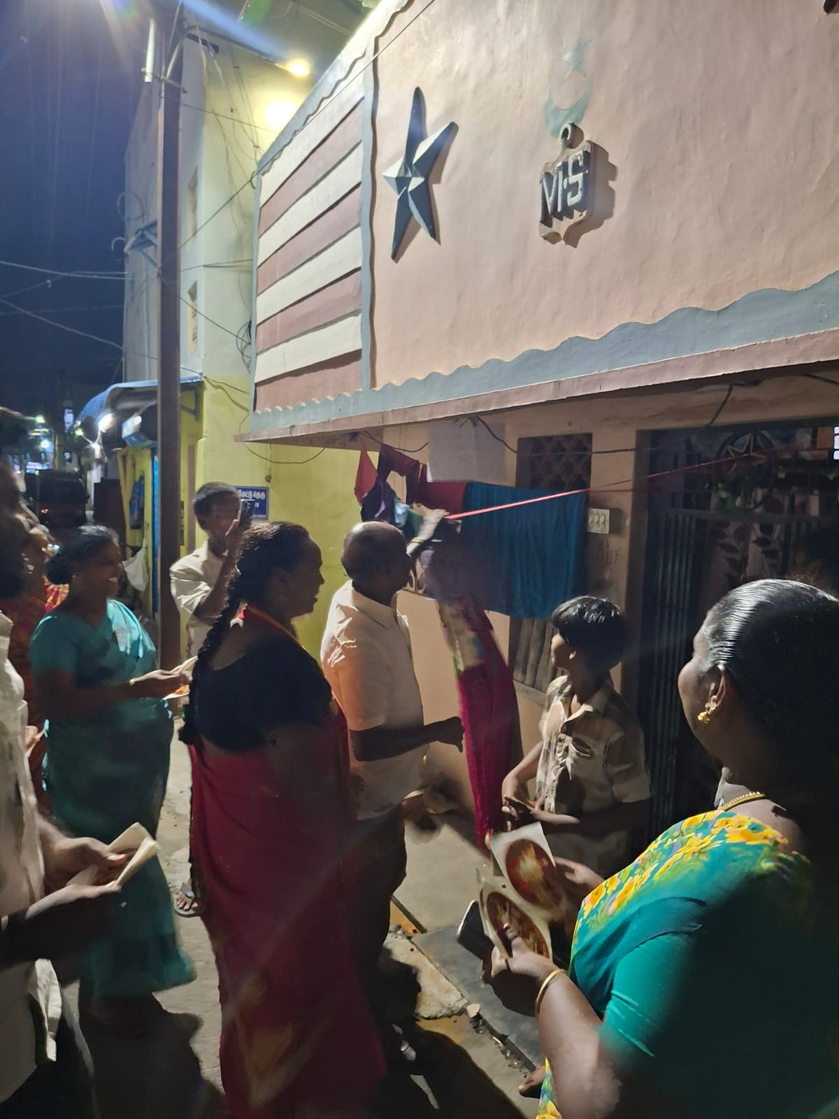 கட்சியின் சின்னம் மற்றும் வேட்பாளர் ஜோசப் விஜய்யின் உருவம் பொறித்த டோர் ஸ்டிக்கர்களை (Door Stickers) வீடுகள் தோறும் ஒட்டி, வாக்காளர்களிடம் ஆதரவு திரட்டினர்.