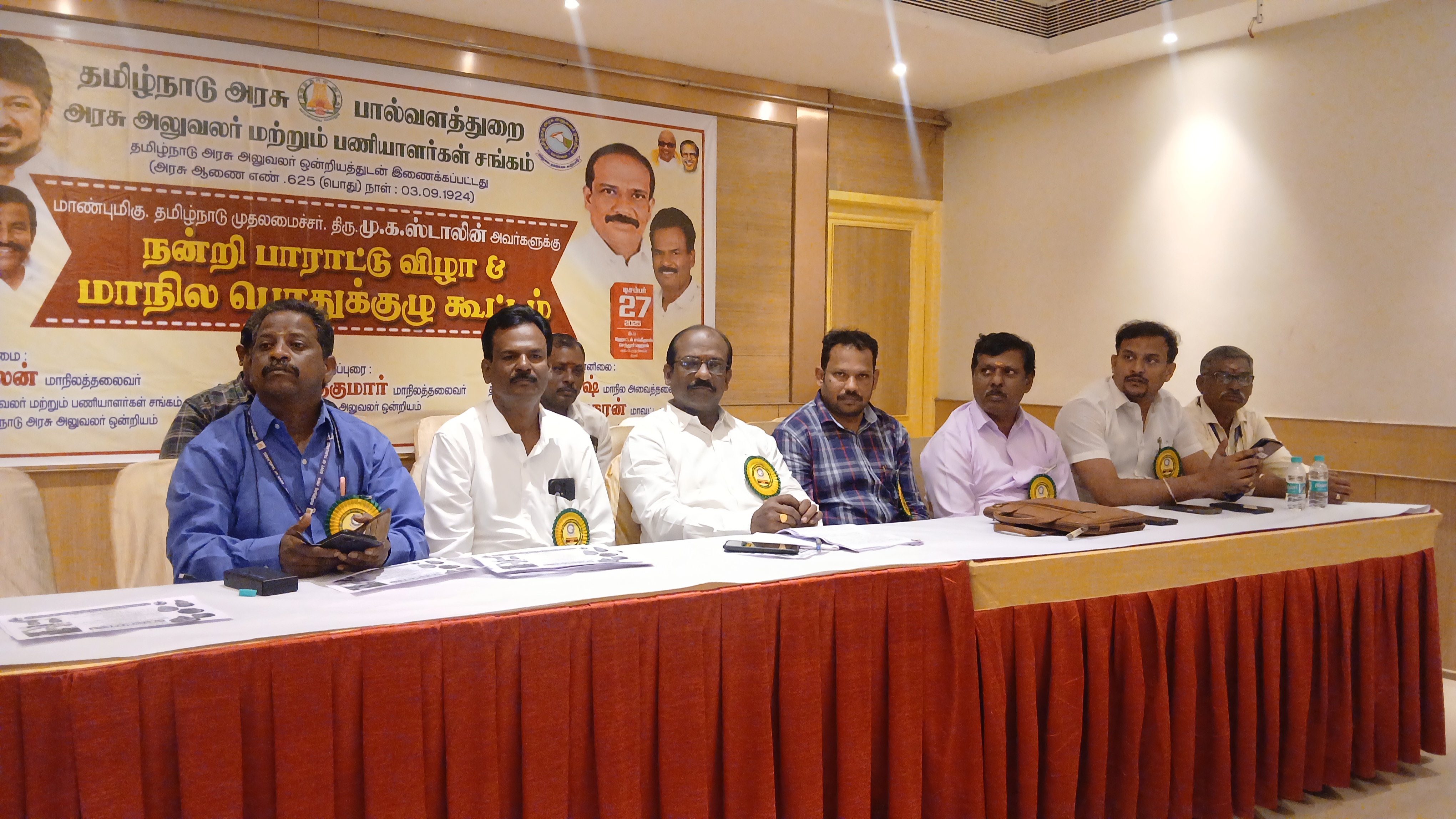 திருச்சி மத்திய பேருந்து நிலையம் அருகே உள்ள தனியார் ஹோட்டலில் தமிழ்நாடு பால்வளத்துறை அரசு அலுவலர் மற்றும் பணியாளர் சங்கத்தின் 40-வது மாநில பொதுக்குழு கூட்டம் மாநில தலைவர் ஜெயபாலன் தலைமையில் நடைபெற்றது. இக்கூட்டத்தில் பால் உற்பத்தியாளர்களுக்கு ஊக்கத்தொகை வழங்கிய தமிழ்நாடு முதலமைச்சர் மு.க.ஸ்டாலின் அவர்களுக்கு நன்றி தெரிவித்து தீர்மானம் நிறைவேற்றப்பட்டது.
