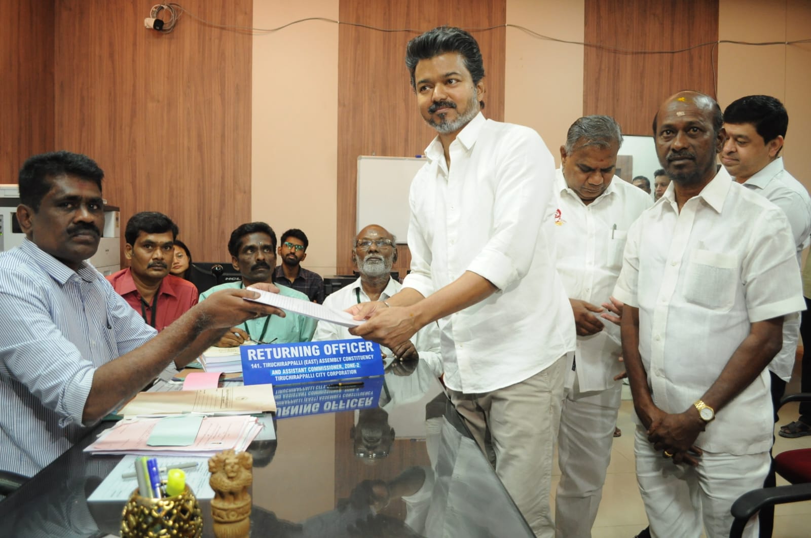 விமான நிலைய வரவேற்பைத் தொடர்ந்து, தமிழக வெற்றிக் கழகம் தலைவர் விஜய் அவர்கள் தேர்தல் நடத்தும் அலுவலரிடம் தனது வேட்புமனுவை முறையாகத் தாக்கல் செய்தார்.