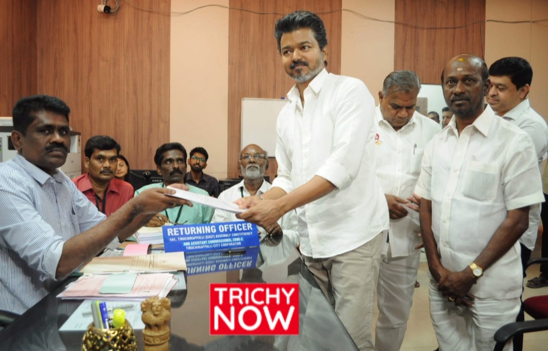 தமிழக அரசியலில் பெரும் எதிர்பார்ப்பை ஏற்படுத்தியுள்ள தமிழக வெற்றி கழகத்தின் தலைவர் விஜய், இன்று திருச்சி கிழக்கு சட்டமன்றத் தொகுதியில் போட்டியிடுவதற்காகத் தனது வேட்புமனுவைத் தாக்கல் செய்தார்.
